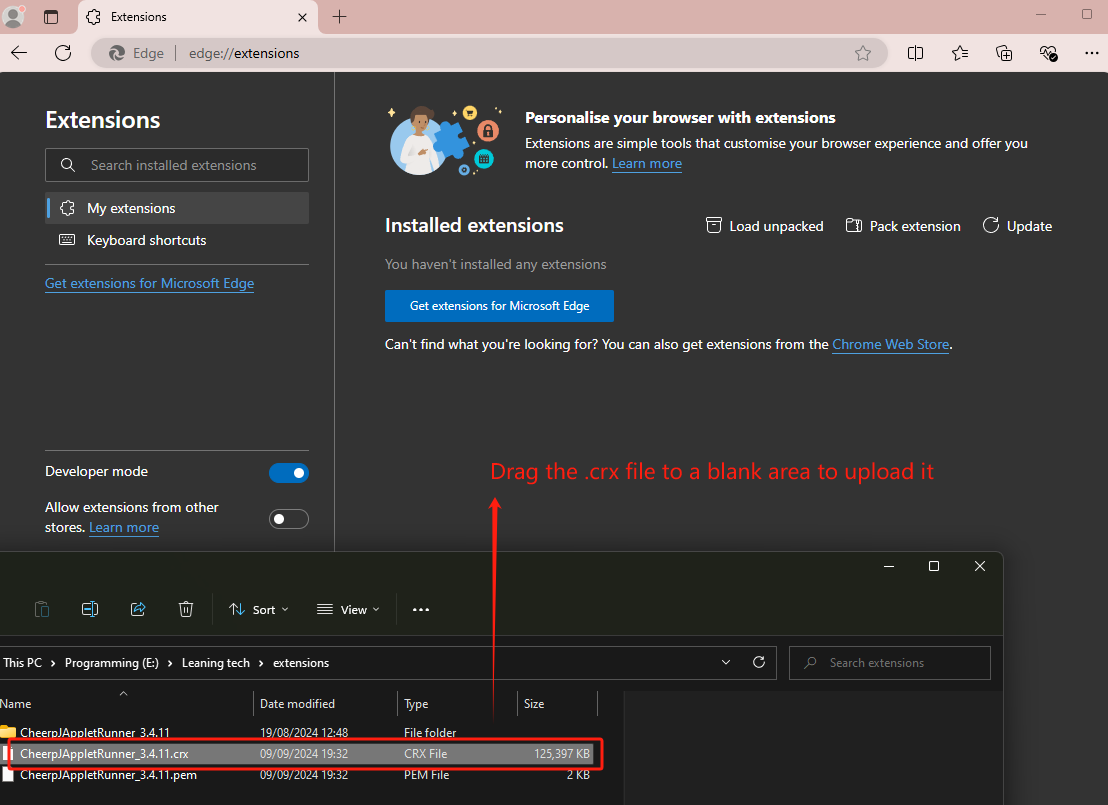 Edge will create two files in the parent directory of your extension: - A .crx file (the packed extension) - A .pem file (the private key, if you didn’t provide one)